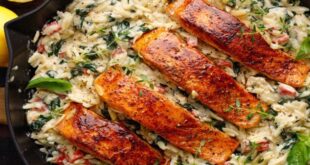 𝐓𝐞𝐧𝐝𝐞𝐫 𝐬𝐚𝐥𝐦𝐨𝐧, 𝐜𝐫𝐞𝐚𝐦𝐲 𝐨𝐫𝐳𝐨, 𝐟𝐫𝐞𝐬𝐡 𝐬𝐩𝐢𝐧𝐚𝐜𝐡, 𝐫𝐨𝐚𝐬𝐭𝐞𝐝 𝐫𝐞𝐝 𝐩𝐞𝐩𝐩𝐞𝐫𝐬, 𝐏𝐚𝐫𝐦𝐞𝐬𝐚𝐧 & 𝐚 𝐬𝐮𝐧𝐬𝐡𝐢𝐧𝐞 𝐬𝐩𝐥𝐚𝐬𝐡 𝐨𝐟 𝐥𝐞𝐦𝐨𝐧 — 𝐚 𝐠𝐨-𝐭𝐨 𝐨𝐧𝐞-𝐩𝐚𝐧 𝐝𝐢𝐧𝐧𝐞𝐫 𝐫𝐞𝐚𝐝𝐲 𝐢𝐧 𝟑𝟎 𝐦𝐢𝐧𝐮𝐭𝐞𝐬! ⏱️ Prep Time: 5 minutes 🔥 Cook Time: 25 minutes ⏳ Total: 30 minutes 📝 INGREDIENTS Salmon: • 4 salmon fillets • 1/2 tsp smoked …